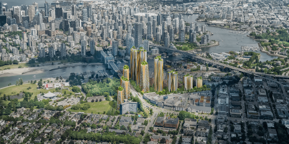 A rendering of residential towers and a courtyard in the Sen̓áḵw development in Vancouver.