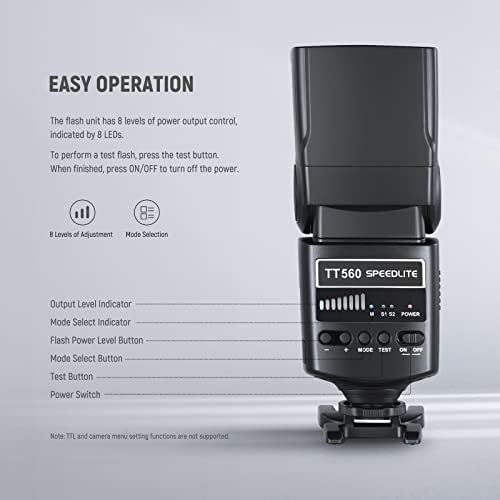 Note: TT560 flash Don’t support TTL and the camera menu setting FunctionPower Management: Switch to the ON, the flash will start charging (the charging indicator is dim)For a test flash, press the test button. After use, press the ON/OFF to OFF to power off.Red charging indicator lamp flickers in every 1s; it indicates low battery; The flash unit has 8 steps of power output control which indicated by 8 pieces of LED