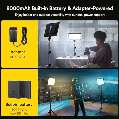 DUAL POWER SUPPLY: Each video light is equipped with two 4000 mA built-in batteries, providing up to 90 minutes of lighting at maximum brightness. The studio lights also support charging while in use, allowing for even longer periods of use. Whether you’re shooting indoors or outdoors, our panel lights will keep you powered up and ready to go